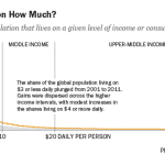 A review of the changing sizes of different income groups brings this point home. From 2001 to 2011, the share of the world’s population that subsisted on $2 or less per day halved from 29% to 15%. At the same time, the share of people classified as low income ($2-10 per day) increased from 50% of the world’s population to 56%. That 6 percentage point increase, in turn, was matched by a similar increase in the share of the world’s population that could be considered middle income (5 percentage points). Meanwhile, the share of the world’s population in higher-income categories barely changed between 2001 and 2011: Those who are upper-middle income increased from 7% to 9% of the global population, and high-income earners ticked up from 6% to 7%.