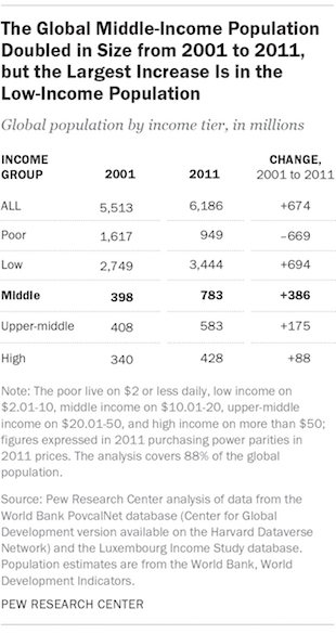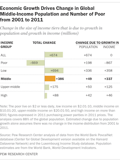 The increase in the middle-income population from 2001 to 2011 is 386 million, a little more than half as much as the increase in the low-income population. But the increase in the middle-income population was almost entirely due to economic growth, as rising incomes added 337 million people to the middle class, compared with the addition of 49 million due to population growth.