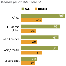 Outside its own borders, neither Russia nor its president, Vladimir Putin, receives much respect or support, according to a new Pew Research Center survey. A median of only 30% see Russia favorably in the nations outside of Russia. Its image trails that of the United States in nearly every region of the world. At the same time, a median of only 24% in the countries surveyed have confidence in Putin to do the right thing in world affairs, and there is far less faith in the Russian leader than there is in U.S. President Barack Obama.