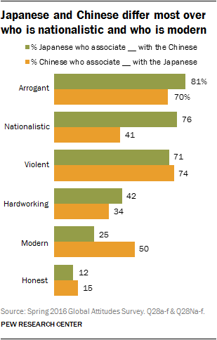 In the case of China and Japan, publics tend to hold largely negative stereotypes of one another. The Chinese and the Japanese see each other as violent. Roughly eight-in-ten Japanese describe the Chinese as arrogant, while seven-in-ten Chinese see the Japanese in that light. Notably, about three-quarters of the Japanese say the Chinese are nationalistic. But only about four-in-ten Chinese associate that word with the Japanese. Neither public sees the other as honest.