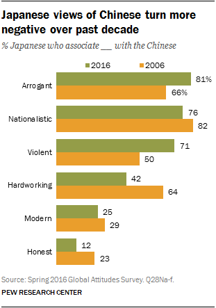 Roughly eight-in-ten Japanese associate arrogance with the Chinese. Only about two-thirds said the Chinese were arrogant a decade ago.