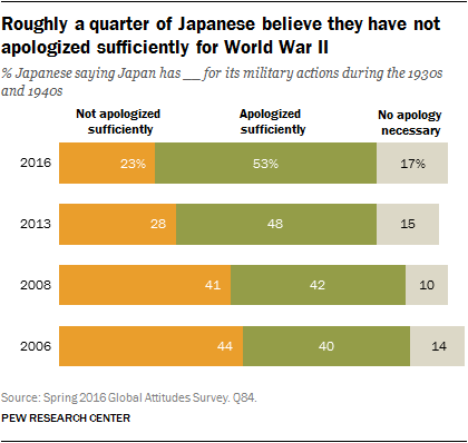 Among the Japanese people, 53% say they have apologized enough for their country’s military actions during the 1930s and 1940s. Such sentiment is up from 40% in 2006. Over that time period, the proportion of the public that believes Japan has not apologized sufficiently has fallen by 21 percentage points, from 44% to 23%. Notably, one-in-six Japanese (17%) say no apology is necessary.