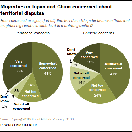 Of course, territorial disputes between China and its neighboring countries involve more nations that just Japan. In a 2015 Pew Research Center survey, 91% of Filipinos and 83% of Vietnamese were worried that such disputes – which for these nations also involve China’s territorial claims in the South China Sea – could lead to a military conflict. In South Korea, 78% were similarly concerned about China’s territorial ambitions.