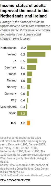 In the U.S., the share of adults in the upper-income tier increased 1.9 percentage points from 1991 to 2010. Meanwhile, the lower-income share also increased, by 0.9 points. The difference – 1 percentage point – is the net gain in the economic status of American adults.