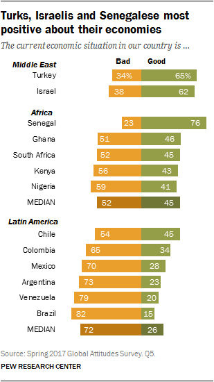 Majorities in all Latin American countries say economic conditions are bad. Just 15% of Brazilians believe their economy – which shrank by 3.4% in 2016, according to the OECD – is in good shape. Venezuelans – whose economy contracted an estimated 18% in 2016 – and Argentinians are not that much more upbeat, with 20% and 23% respectively having positive views of their economies. The most satisfied with their economic situation among the Latin Americans surveyed are the Chileans. And even there only 45% say the economy is good.
