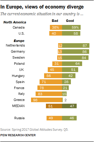 What a difference a year can make – or possibly an election, a rise in the stock market and a falloff in the U.S. unemployment rate. The U.S. economy grew by 1.5% in 2016, down from 2.6% growth in 2015, according to OECD data. Nevertheless, six-in-ten people in the United States (58%) say the economic situation is very or somewhat good. In 2016 just 44% of the American public described the economy as good.