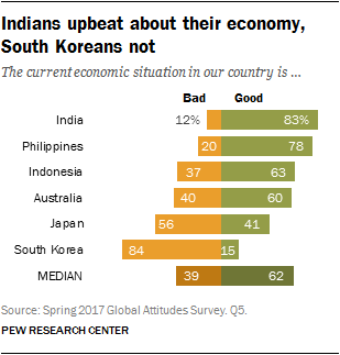 In the Asian-Pacific nations surveyed, Indians and Filipinos are the most positive about their economic conditions. The South Koreans are the most downbeat.