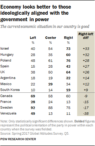 In many of the countries where those on the right are more upbeat about the national economy, right-of-center governments are in power. And where those on the left are more optimistic about the economy, left-of-center governments were in power at the time of the survey.
