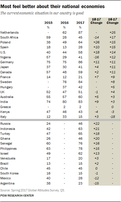 Nearly a decade after the worst economic downturn since the Great Depression, economic spirits are reviving. Many Europeans, Japanese and Americans feel better today about their economies than they did before the financial crisis. More broadly, in 11 of 18 countries from across the globe that were surveyed in both 2016 and 2017, publics feel more positive about their economy than they did a year ago. The Dutch, Germans, Swedes and Indians see their national economies in the most positive light. While global publics are increasingly upbeat about economic conditions, the overall view of the economy is still in negative territory in many countries. Overall, a median of only 46% in the 32 nations surveyed this year say their current economy is doing well.