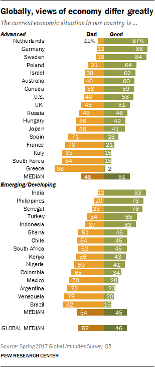 The modest but sustained economic recoveries in Australia, Canada, Europe, Japan and the U.S. since the 2007-2008 financial crisis have finally buoyed public spirits about economic conditions in those countries. A median of 51% in the 17 advanced economies surveyed believes that their current economic situation is good, 45% think it’s bad. Strong upbeat sentiment in northern Europe in particular offsets quite downbeat views in southern Europe and South Korea.