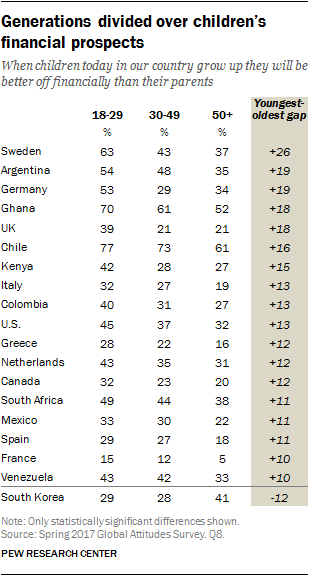 In more than half of the countries surveyed, people ages 18 to 29 are more optimistic than those ages 50 and older about the next generation’s financial prospects. This is true in nations where people feel quite positive about their economy and in societies where people are very negative.