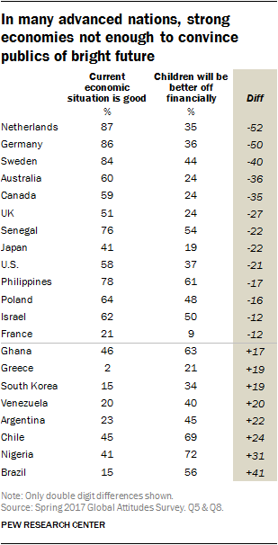 At the same time, only 15% of Brazilians believe their country’s economic situation is good, while 56% say the country’s children will do better than their parents, a 41-point differential. In Nigeria there is also a downbeat view of the current economy: Just 41% believe it is doing well. Yet this is coupled with an optimistic expectation for the future: 72% of Nigerians say the nation’s kids will be better off, a 31-point difference.