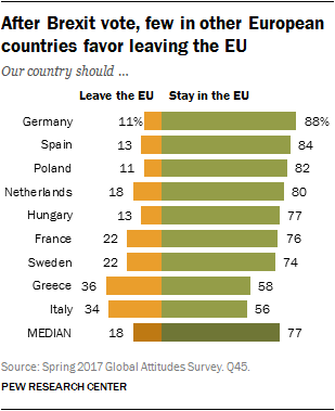 Eight-in-ten or more in Germany (88%), Spain (84%), Poland (82%) and the Netherlands (80%) back remaining in the EU. More than seven-in-ten in Hungary (77%), France (76%) and Sweden (74%) agree. Even in Greece, where the public is highly critical of the EU, 58% of the public wants to continue to be a member.