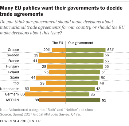 The authority to make trade agreements has rested with Brussels since 1957, when the European Economic Community, predecessor of the EU, was created. In recent years such accords have been met with a great deal of public resistance. And majorities in Greece (63%), Sweden and France (both 56%), and Hungary (55%) want the power to make trade deals back in the hands of their national governments, as do about half of Poles, Spanish and Italians. Only Germans (60%) want trade agreement authority to remain with the EU. In France, Hungary, Italy and the Netherlands, more people on the right than on the left want to reclaim trade decision making. And it is older people more than younger people in France, Germany and the Netherlands who want to reclaim that sovereignty.